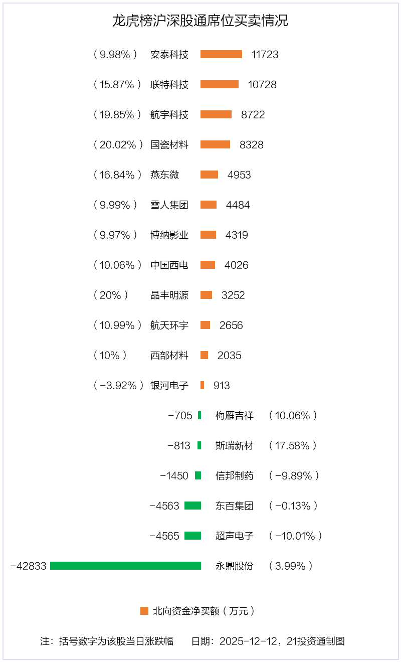 12月12日,北向资金参与龙虎榜中的个股共有18只,合计净买入1.12亿元。其中沪股通净买入5 股,净卖出4 股,合计净卖出2.53亿元;深股通净买入7 股,净卖出2 股,合计净买入3.65亿元。