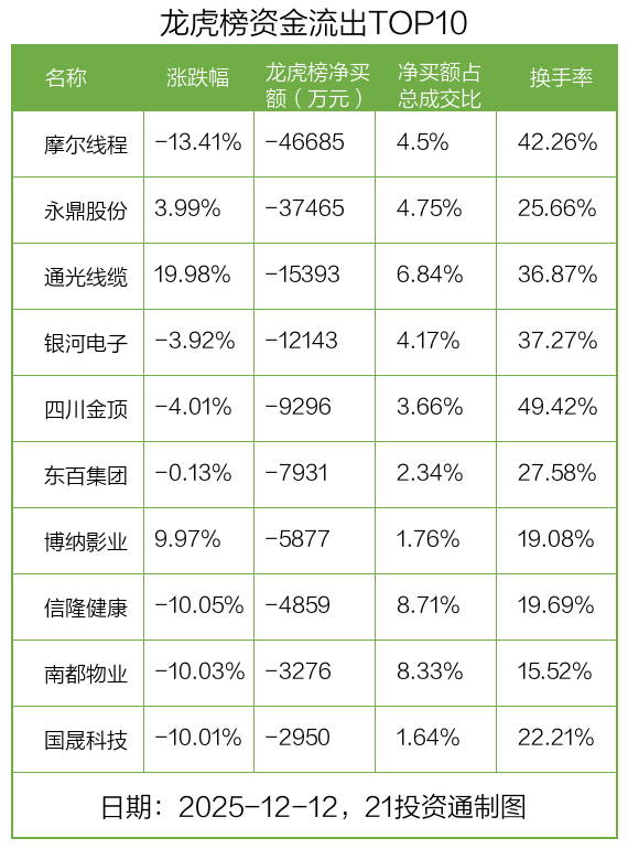 而龙虎榜中资金净流出最多的是摩尔线程(688795.SH),被净卖出为4.67亿元,占总成交金额的4.5%。摩尔线程收盘下跌13.41%,换手率为42.26%。