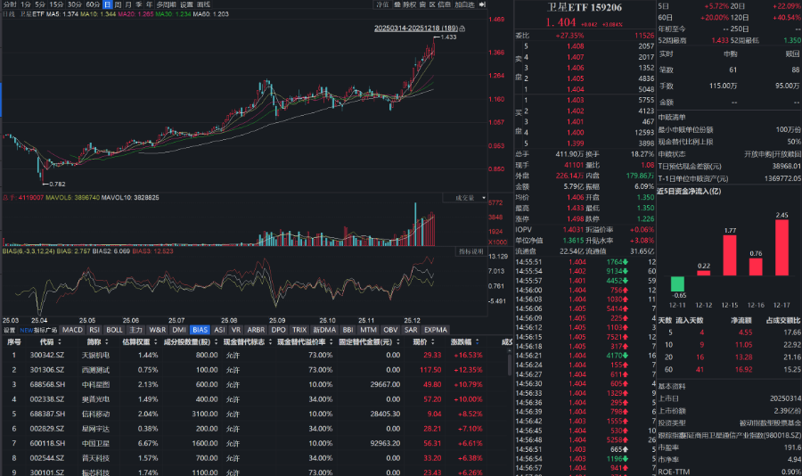 值得一提的是,卫星ETF(159206)规模(截至12月17日)破30亿元,12月18日盘内市价达1.433元,均创下成立以来新高。资金流入方面,近五个交易日净流入超4.5亿元。卫星ETF(159206)也是全市场同品类产品中规模最大的ETF,流动性佳,近五日(12月11日—12月18日 )日均成交额达5.26亿元。