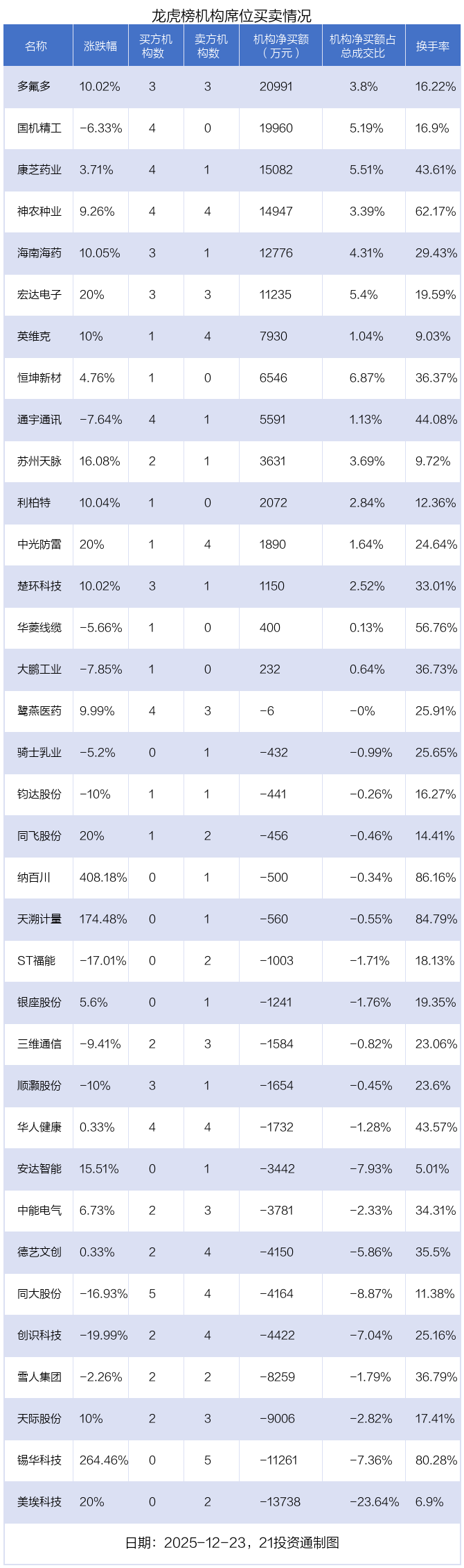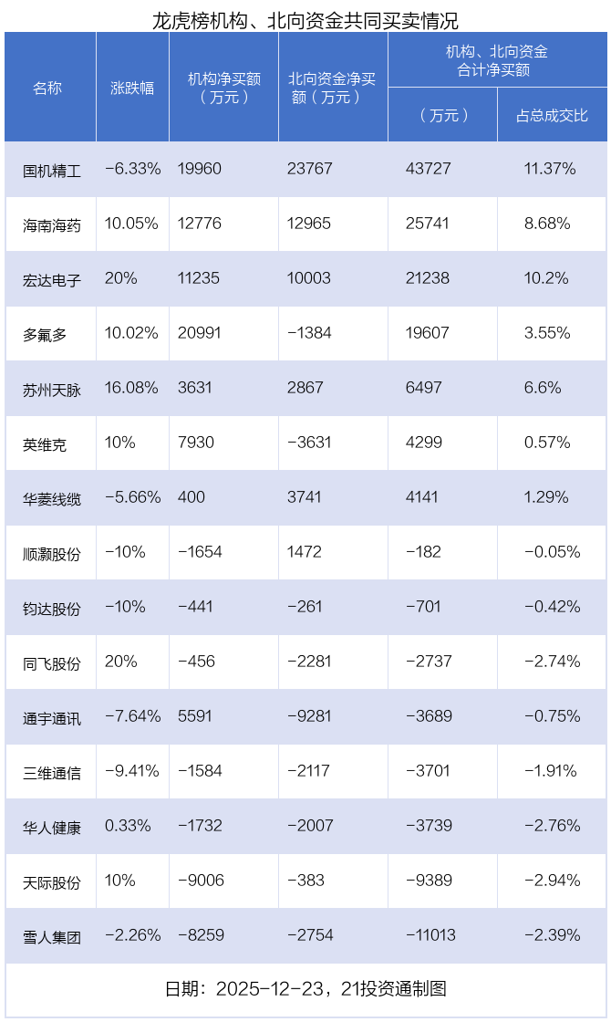 12月23日,35只个股龙虎榜出现了机构的身影,机构合计净买入5.26亿元。具体来看,机构净买入15股,净卖出20股。