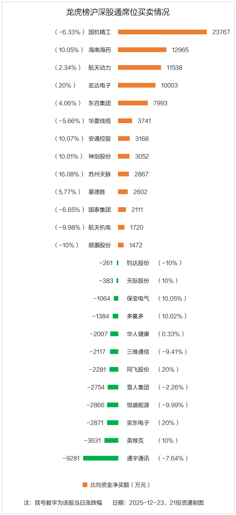 12月23日,北向资金参与龙虎榜中的个股共有25只,合计净买入5.61亿元。其中沪股通净买入6股,净卖出2股,合计净买入2.52亿元;深股通净买入7股,净卖出10股,合计净买入3.09亿元。