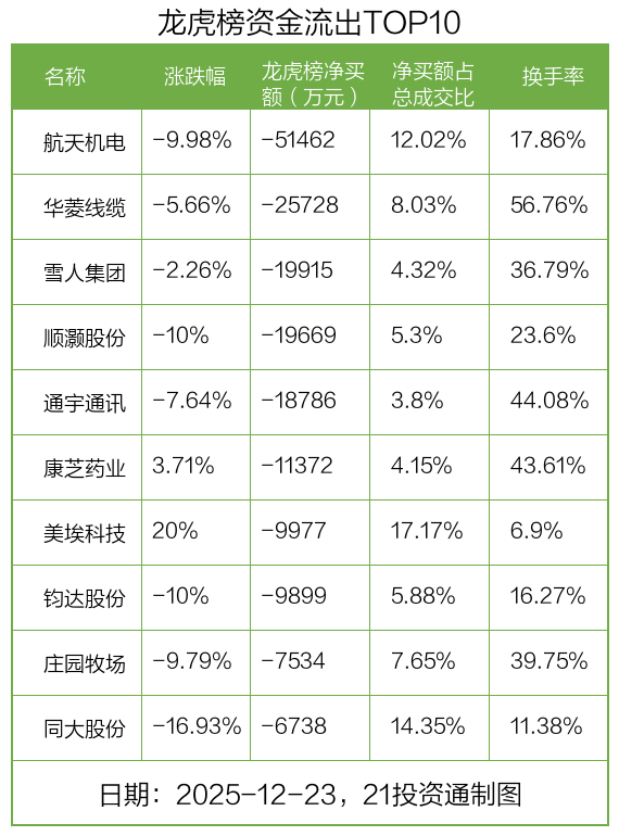 而龙虎榜中资金净流出最多的是航天机电(600151.SH),被净卖出为5.15亿元,占总成交金额的12.02%。航天机电收盘下跌9.98%,换手率为17.86%。