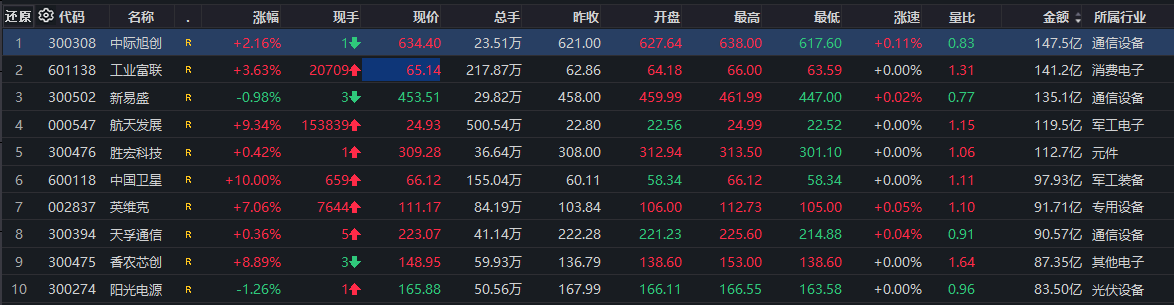 个股方面,中际旭创成交额居首,为147.5亿元。其后是工业富联、新易盛、航天发展、胜宏科技,成交额分别为141.3亿元、135.1亿元、119.5亿元、112.7亿元。