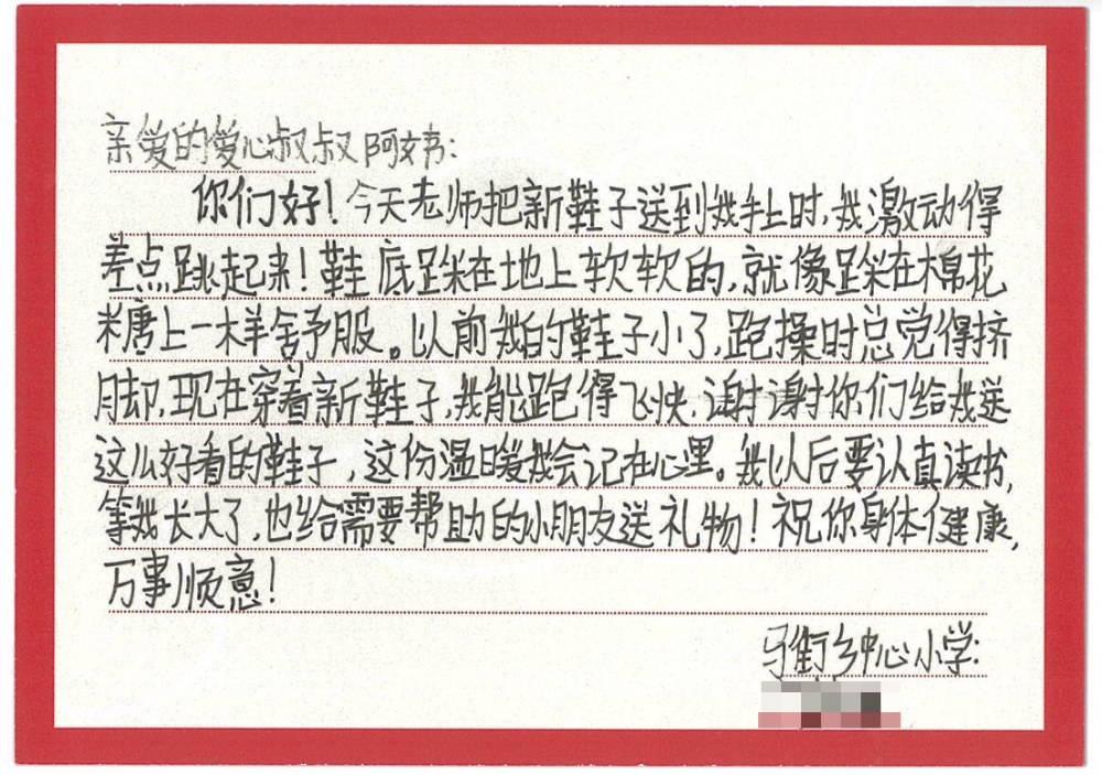 礼物送达当天,学校操场成了温暖的海洋。鞋盒打开时,惊喜的欢呼此起彼伏。穿上新鞋,孩子们迫不及待地在操场跑了几圈。“鞋底软软的,像踩在棉花糖上一样舒服。以前我的鞋子小了,跑操时总觉得挤脚,现在穿着新鞋子,我能跑得飞快。”一个孩子随后写下了他的感受。这份快乐,源自被精准呵护的踏实感。