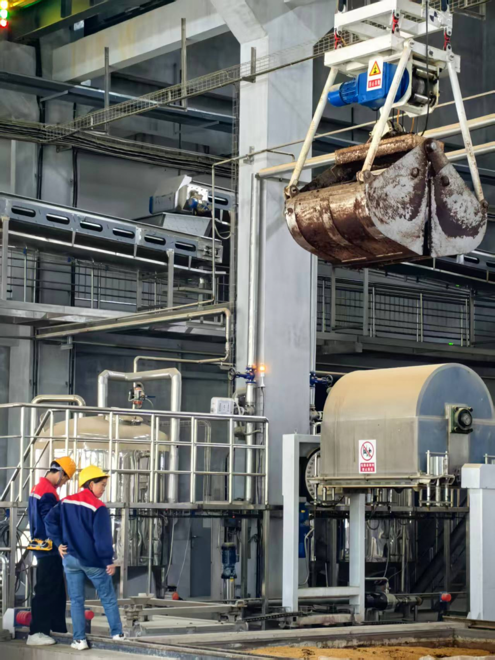 另一处,行车在窖池上方来回移动,一个工人身上斜挎着盒子大小的遥控器,手里操作着按钮,行车“听话”地翻斗和投料。这比一铲又一铲的人工投料轻松多了,大大节约了时间。