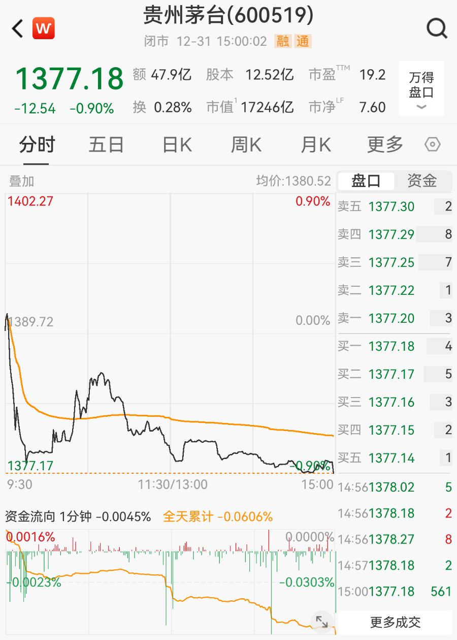 截至2025年12月31日收盘,贵州茅台报1377.18元/股,跌0.9%,总市值为17246亿元。
