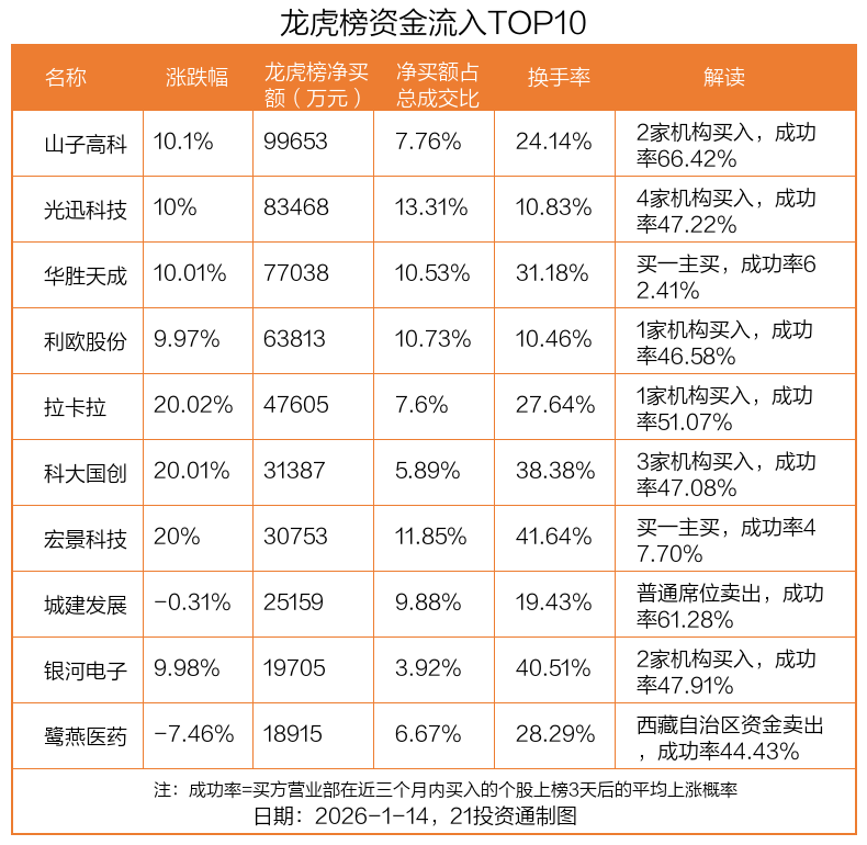 1月14日,上证指数下跌0.31%,深证成指上涨0.56%,创业板指上涨0.82%。盘后龙虎榜数据显示,共有61只个股因当日异动登上龙虎榜,资金净流入最多的是山子高科(000981.SZ),达9.97亿元。