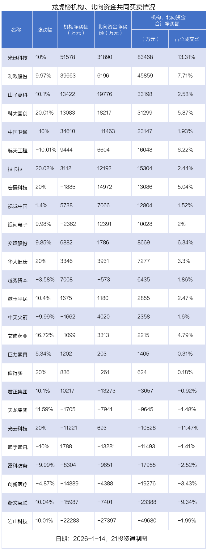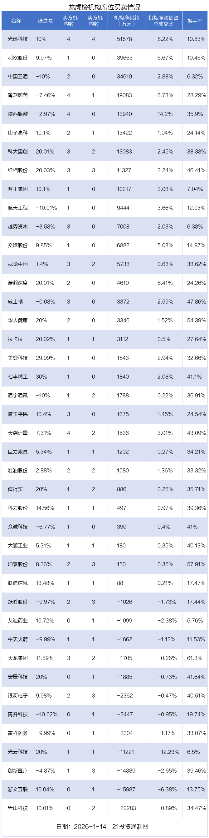 1月14日,42只个股龙虎榜出现了机构的身影,机构合计净买入17.87亿元。具体来看,机构净买入30股,净卖出12股。