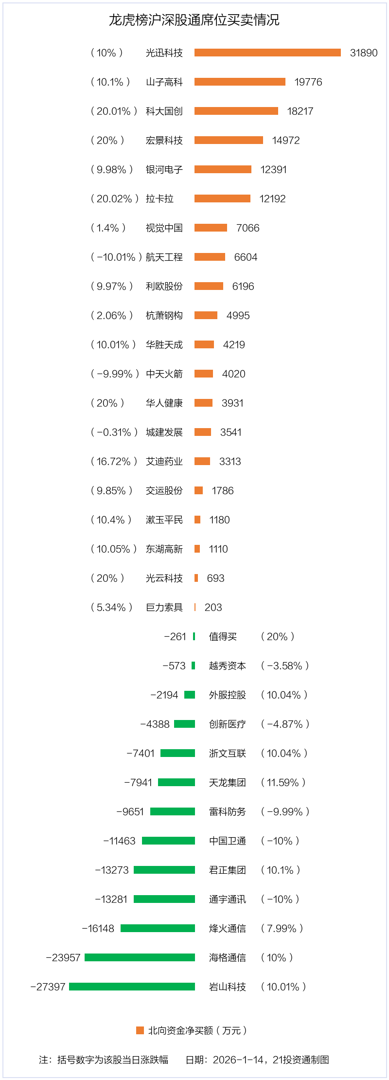 1月14日,北向资金参与龙虎榜中的个股共有33只,合计净买入2.04亿元。其中沪股通净买入8 股,净卖出5 股,合计净卖出2.42亿元;深股通净买入12 股,净卖出8 股,合计净买入4.46亿元。