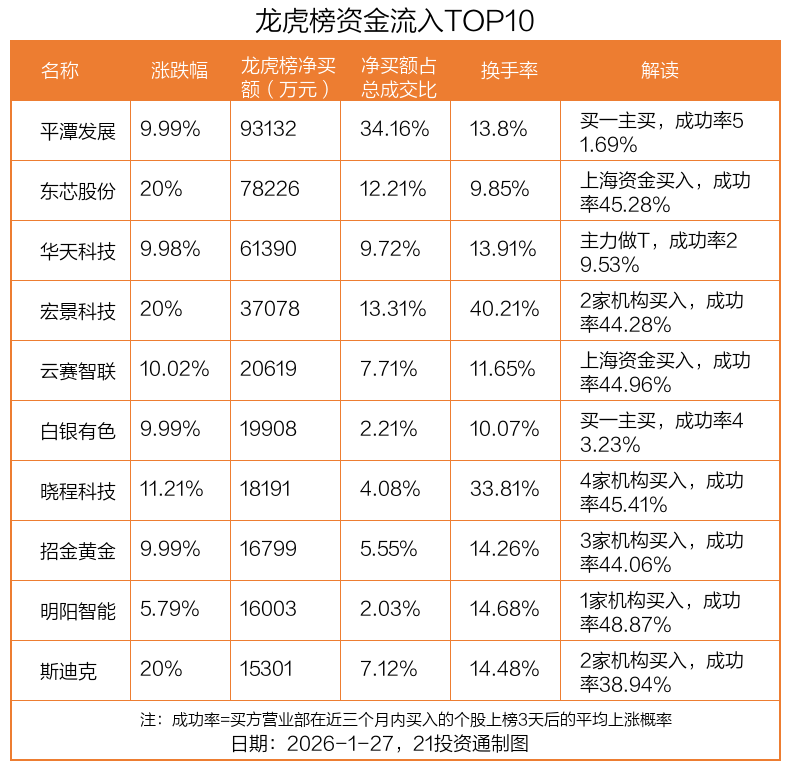 1月27日,上证指数上涨0.18%,深证成指上涨0.09%,创业板指上涨0.71%。盘后龙虎榜数据显示,共有57只个股因当日异动登上龙虎榜,资金净流入最多的是平潭发展(000592.SZ),达9.31亿元。