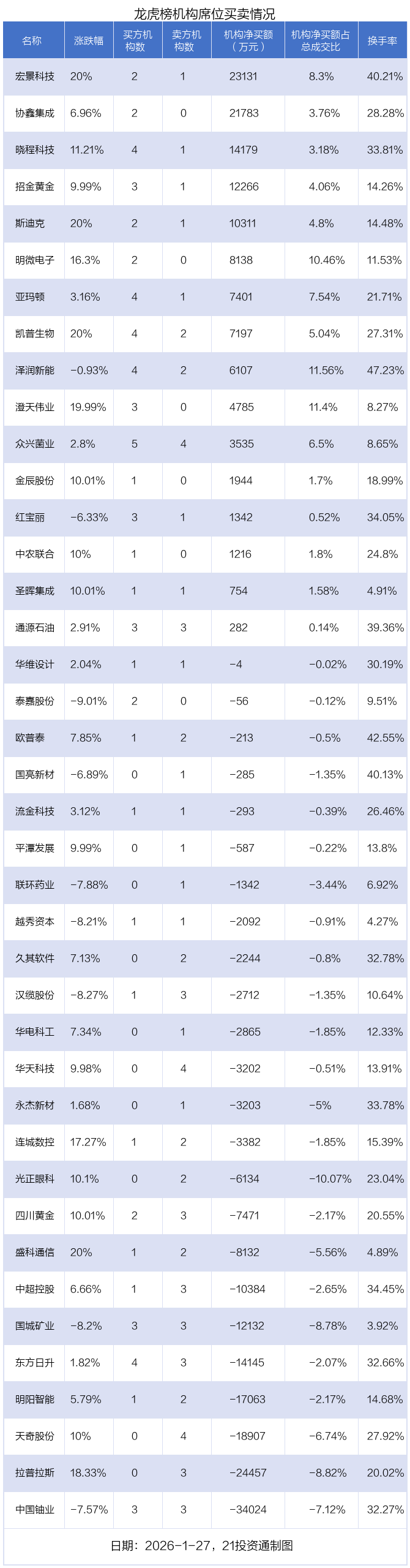 1月27日,40只个股龙虎榜出现了机构的身影,机构合计净卖出5.1亿元。具体来看,机构净买入16股,净卖出24股。