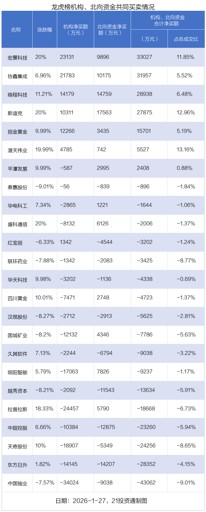 值得注意的是,机构和北向资金共同净买入了斯迪克、晓程科技、协鑫集成、宏景科技、招金黄金、澄天伟业等6股;共同净卖出了泰嘉股份、华天科技、联环药业、汉缆股份、天奇股份、久其软件、中国铀业、越秀资本、中超控股、东方日升等10股;在明阳智能、盛科通信、拉普拉斯、国城矿业、平潭发展、四川黄金、华电科工、红宝丽上出现分歧,机构净卖出明阳智能1.71亿元,北向资金净买入7825.51万元;机构净卖出盛科通信8131.84万元,北向资金净买入6126.29万元;机构净卖出拉普拉斯2.45亿元,北向资金净买入5789.55万元;机构净卖出国城矿业1.21亿元,北向资金净买入4345.62万元;机构净卖出平潭发展586.64万元,北向资金净买入2994.57万元;机构净卖出四川黄金7471.23万元,北向资金净买入2748.03万元;机构净卖出华电科工2865.12万元,北向资金净买入1220.77万元;机构净买入红宝丽1341.86万元,北向资金净卖出4543.94万元。