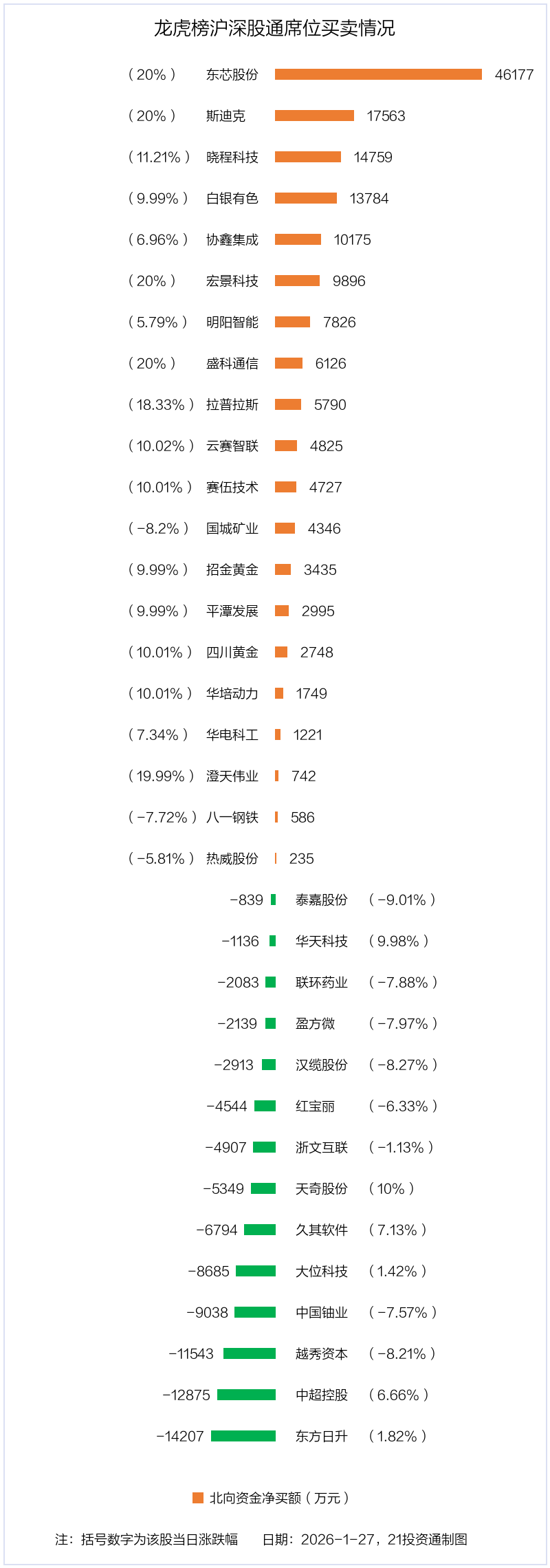 1月27日,北向资金参与龙虎榜中的个股共有34只,合计净买入7.27亿元。其中沪股通净买入11股,净卖出3股,合计净买入7.74亿元;深股通净买入9股,净卖出11股,合计净卖出4718.8万元。