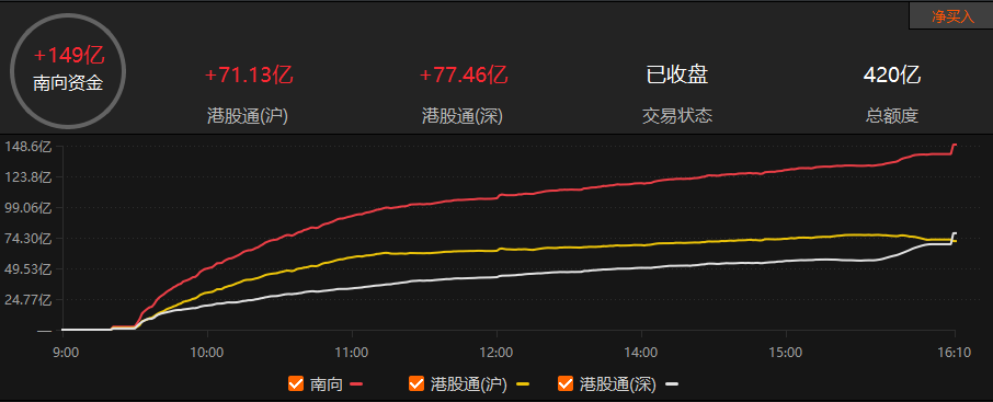 南向资金方面,当天南向资金净买入额达149亿港元,沪股通和深股通分别为71.13亿港元和77.46亿港元。