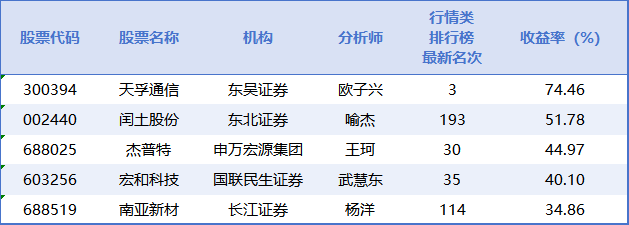 业绩预增和明星分析师的双重加持,使得这些公司在二级市场上表现出色。从收益率数据来看,部分公司在分析师点评后的表现十分亮眼。天孚通信在获得多位明星分析师点评后,最高收益率达到74.46%,位列所有公司之首;闰土股份、杰普特、宏和科技、南亚新材等公司的收益率也均超过30%,显著跑赢同期大盘。