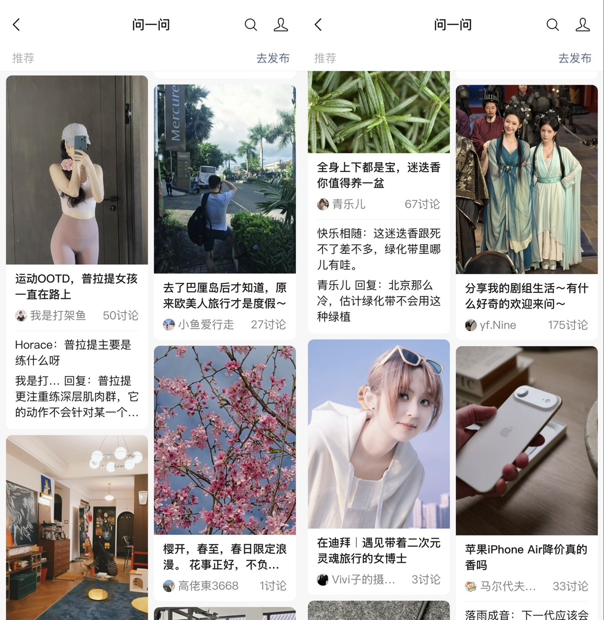 比如,微信“问一问”的Feed流展示,如果你同时打开微信“问一问”和小红书,在没有名字的情况下,很有可能把两者搞混淆。当然这种图文呈现双列展示的形式并非小红书独有,但它在这方面的“标签”贴得最牢,从内容的展示形式来看,微信“问一问”也学小红书模式,可问题在于,会有用吗?