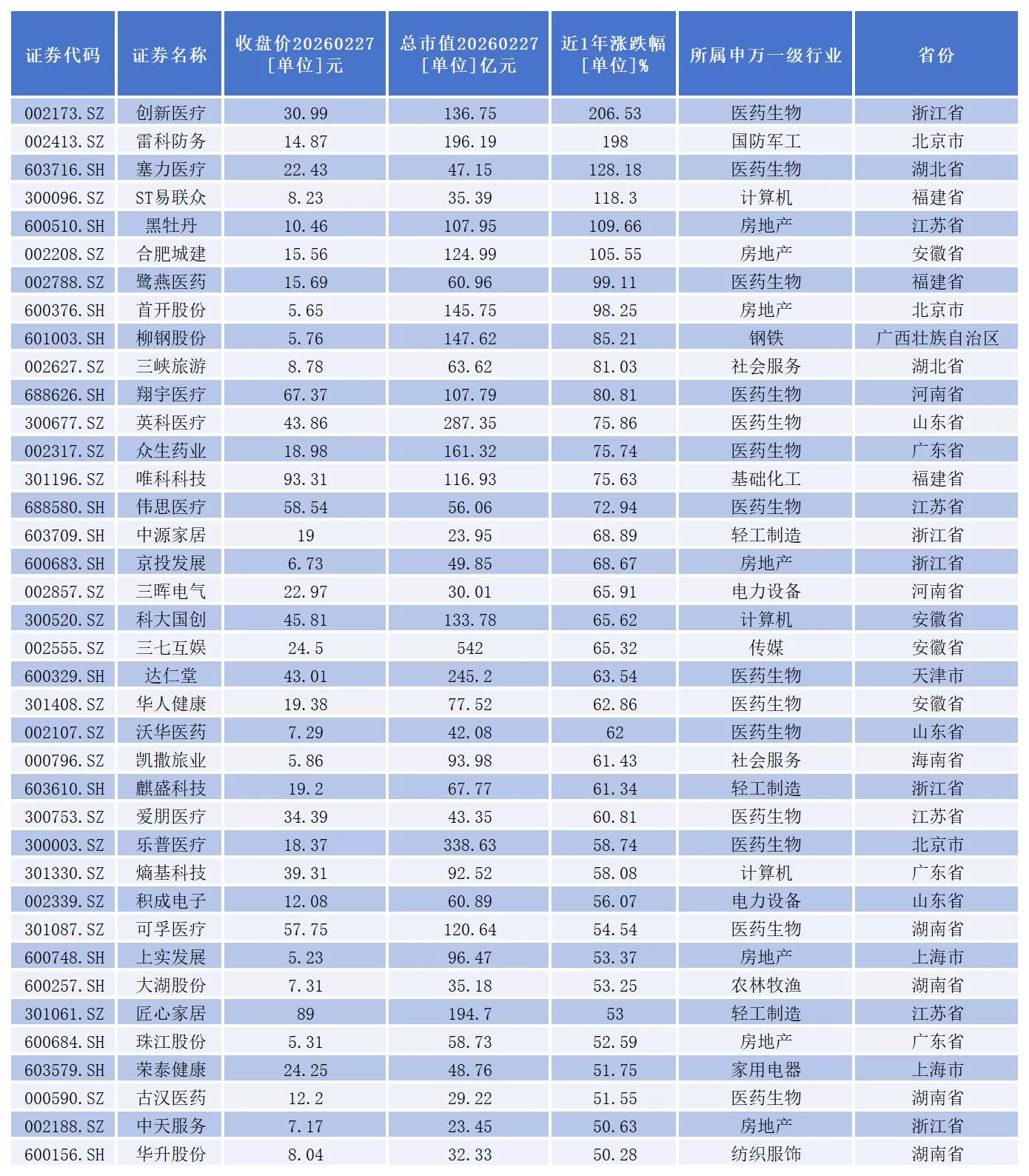 创新医疗(002173.SZ)、雷科防务(002413.SZ)、塞力医疗(603716.SH)、ST易联众(300096.SZ)、黑牡丹(600510.SH)、合肥城建(002208.SZ)等6家公司涨幅超过100%。