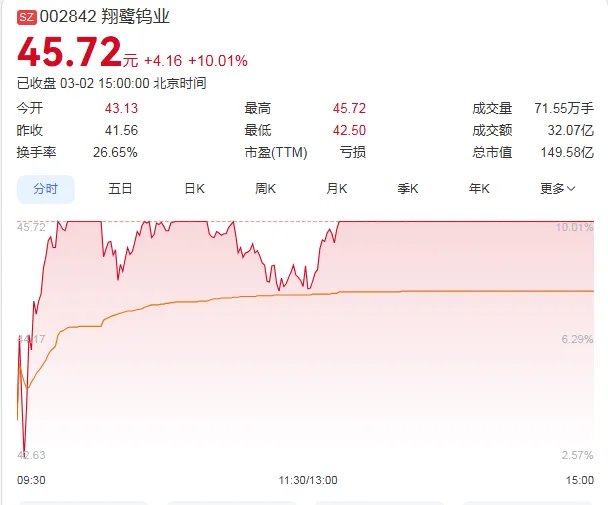 3月2日,翔鹭钨业强势涨停,收盘价为45.72元,成交额为32.07亿元,总市值攀升至149.58亿元。据统计,自2025年12月15日以来的48个交易日内,翔鹭钨业股价累计涨幅超过296%,表现非常亮眼。