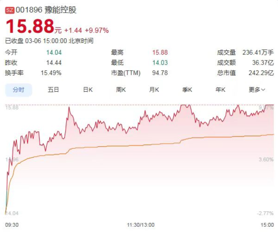 3月6日,豫能控股强势涨停,收盘价为15.88元,成交额为36.37亿元,总市值攀升至242.29亿元。据统计,自2026年2月6日以来的15个交易日内,豫能控股股价累计涨幅超过160%,表现非常亮眼。