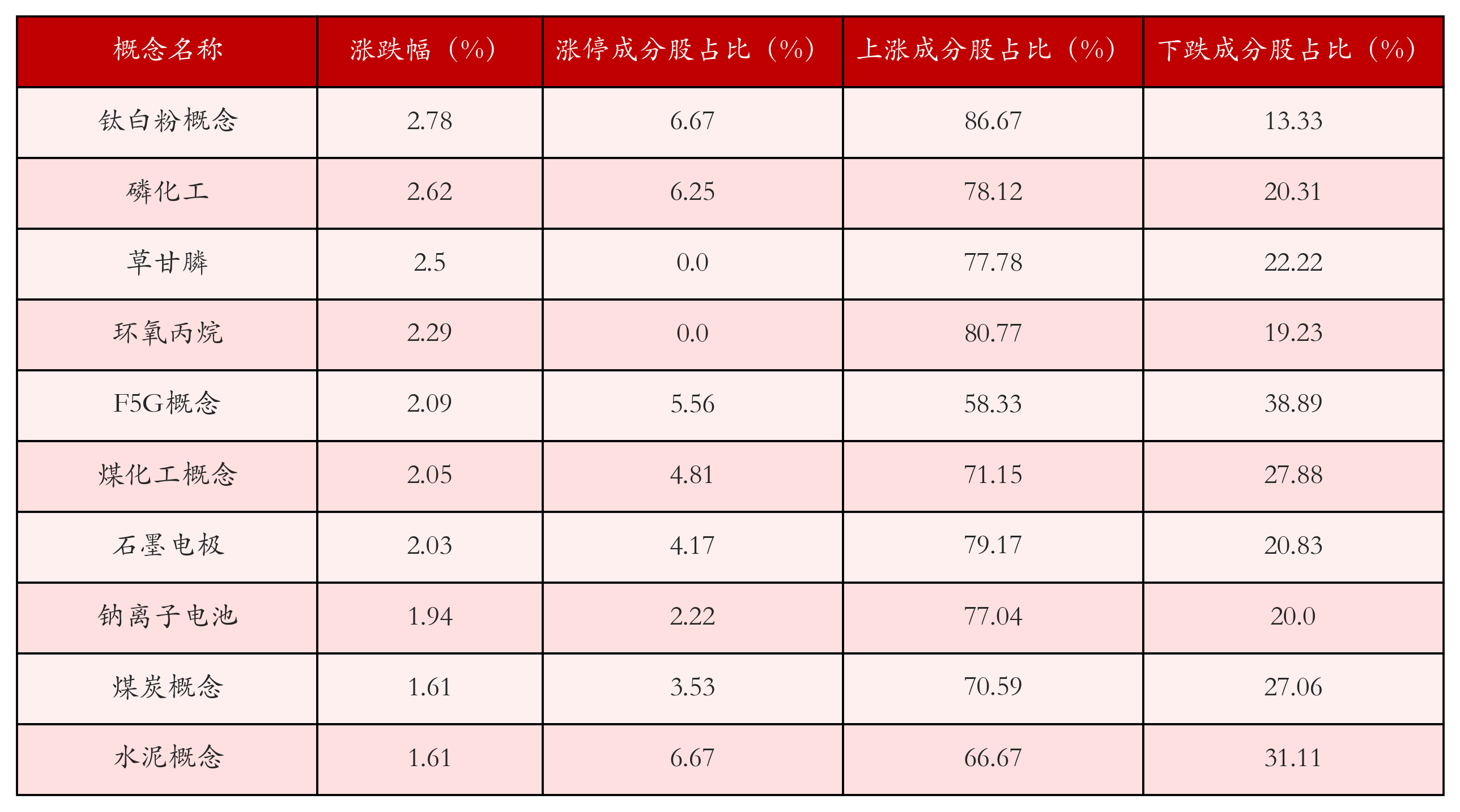 根据A股概念涨跌幅与所对应的股票池综合分析,涨幅靠前的三个概念板块分别为:钛白粉概念、磷化工与草甘膦。排名前10位的概念板块相关数据见下表: