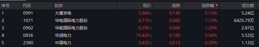 电力板块表现活跃,大唐发电涨超5%,华能国际电力股份、华电国际电力股份涨超1%。