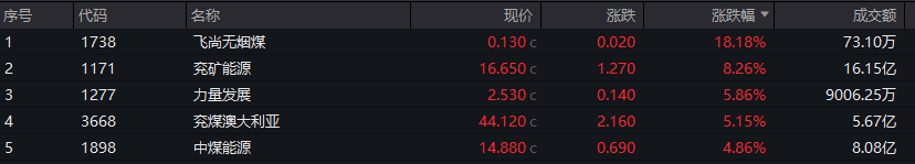 煤炭板块维持强势,飞尚无烟煤涨超18%,兖矿能源涨超8%,力量发展、兖煤澳大利亚涨超5%。