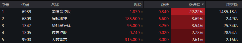 半导体板块间表现分化,华虹半导体、澜起科技涨超3%,天数智芯涨超2%,上海复旦跌超3%,中芯国际下跌1%。