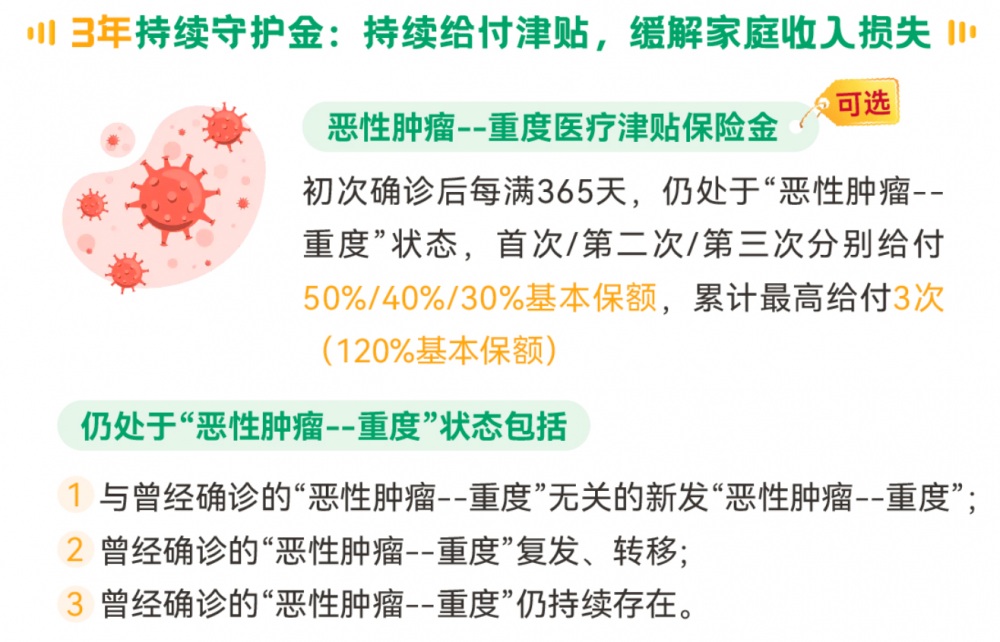 得病赔,治疗也赔:“守护如初防癌险”开创“恶性肿瘤-重度医疗津贴”责任,首次确诊赔付后,如果癌症状态持续,每满365天还可额外领取一笔医疗津贴,累计最高可达保额的120%,为漫长的治疗期提供持续现金流支持。