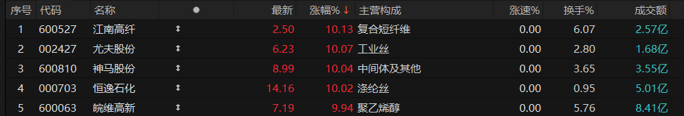 4月7日,化学纤维板块大涨,江南高纤、尤夫股份、神马股份、恒逸石化、皖维高新涨停。