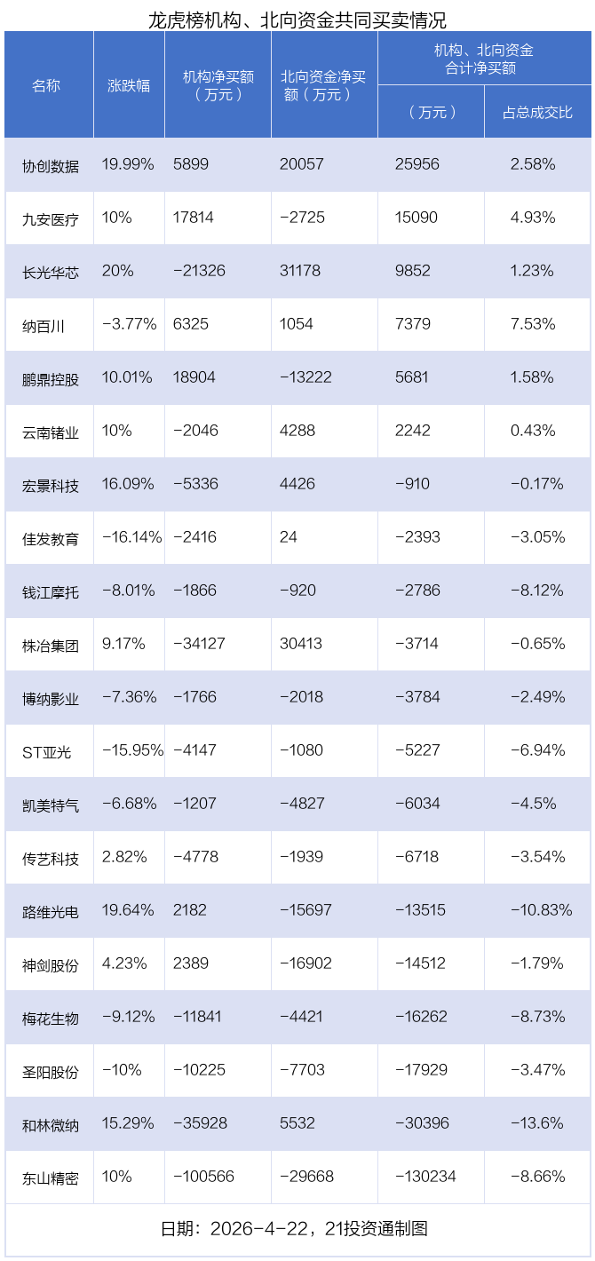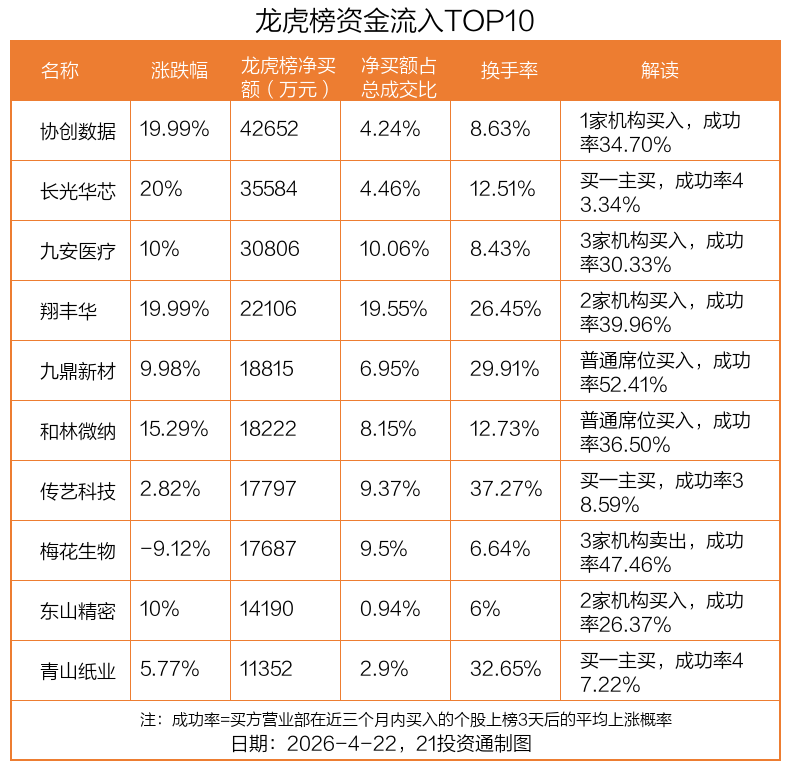 4月22日,上证指数上涨0.52%,深证成指上涨1.3%,创业板指上涨1.73%。盘后龙虎榜数据显示,共有51只个股因当日异动登上龙虎榜,资金净流入最多的是协创数据(300857.SZ),达4.27亿元。