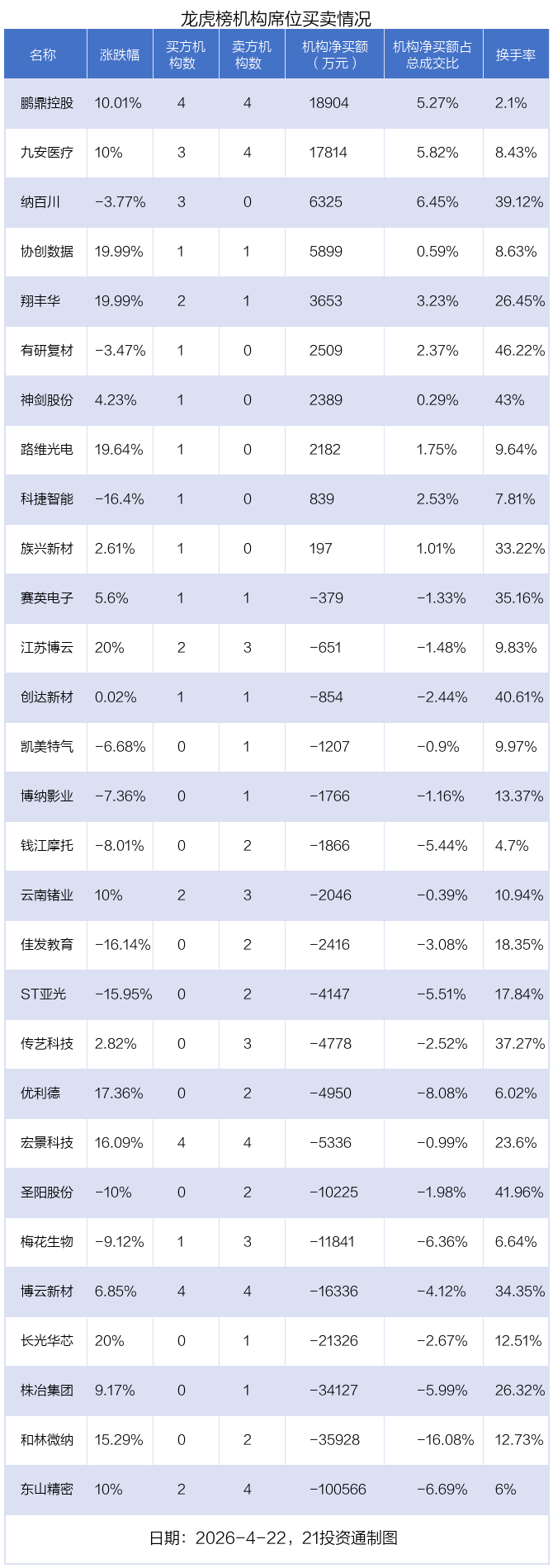 4月22日,29只个股龙虎榜出现了机构的身影,机构合计净卖出20亿元。具体来看,机构净买入10股,净卖出19股。