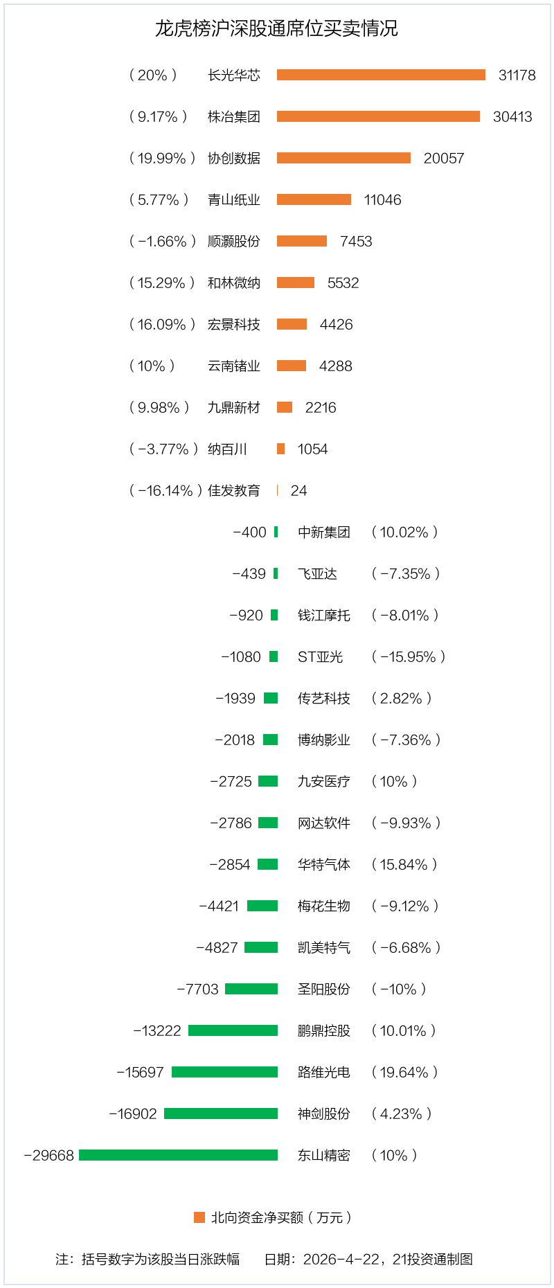 4月22日,北向资金参与龙虎榜中的个股共有27只,合计净买入1.01亿元。其中沪股通净买入4股,净卖出5股,合计净买入5.2亿元;深股通净买入7股,净卖出11股,合计净卖出4.19亿元。
