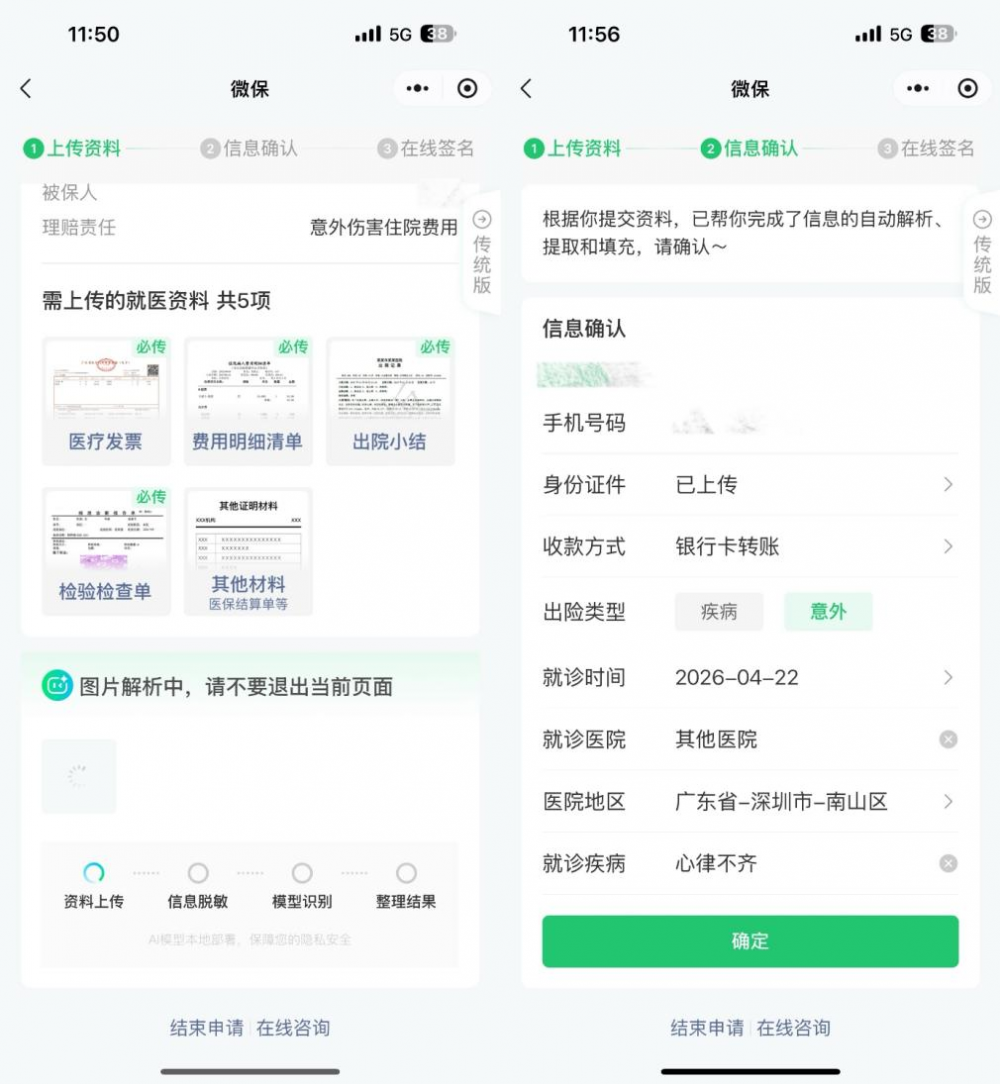 在AI自动化录单环节,借助智能识别与跨源信息融合技术,可在5秒内完成个人信息、保单信息、就医信息等关键字段自动填报,联动历史理赔记录交叉校验关键要素,用户仅需一键确认即可完成报案,大幅压缩操作时长。