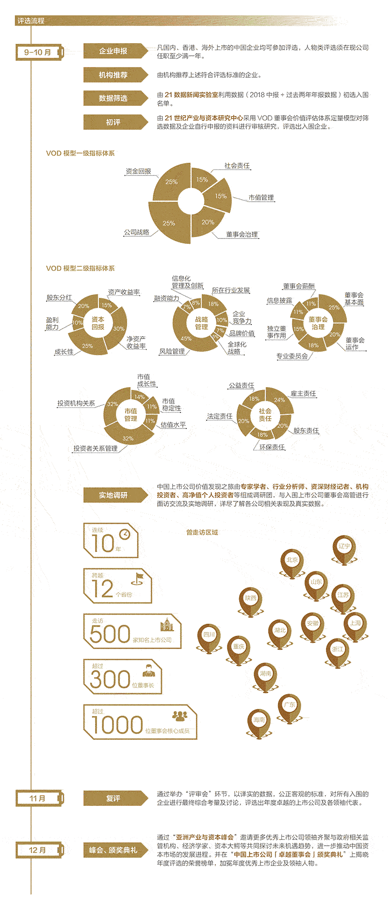 每届活动,组委会将邀请专业数据机构先通过年报数据进行筛选,再通过行业专家及金融机构组成评审团,采用VOD董事会价值评估的定量模型研究系统,从资本回报、战略管理水平、董事会治理、社会责任、市值管理五大指标体系,对78项与上市公司董事会价值有关的指标数据进行模型研究和客观评价。期间还发起“走进董事会——中国上市公司价值发现之旅”活动,组织“学术专家、机构专业人士、资深财经记者、高净值投资者”等人群组成的走访调研团,实地对参评公司的董事会进行调研和客观的综合评价。最终结合“专家评审会”环节,以详实的数据,公正客观的标准,对所有入围的企业进行最终综合考量及讨论,评选出年度卓越的上市公司及各领袖代表。