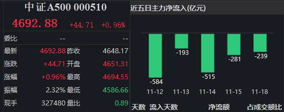 11月19日,市场午后V型反弹,创业板指领涨,沪指3300点失而复得。中证A500指数(000510.CSI)收涨0.96%,报4692.88点。