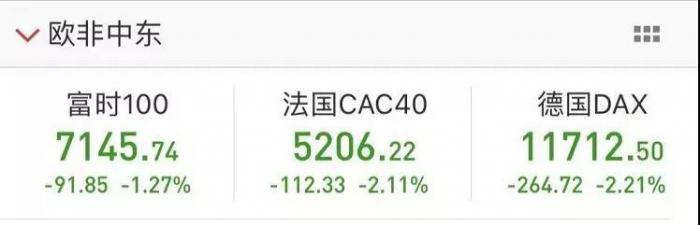 德国DAX 30指数收跌2.21%,法国CAC 40指数收跌2.11%。英国富时100指数收跌1.27%,意大利富时MIB指数收跌1.71%。