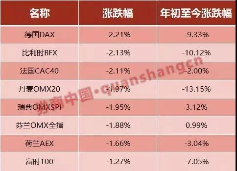 此外,比利时BFX跌2.13%,丹麦OMX20跌1.97%,瑞典OMXSPI跌1.95%,芬兰OMX全指跌1.88%,荷兰AEX跌1.66%。
