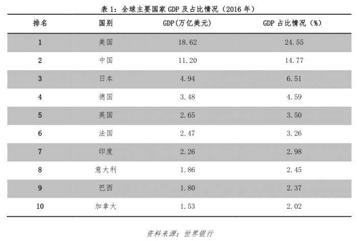 2017年全球经济实现自 2011 年以来的最快增长,根据世界银行发布的数据,全球2016年GDP总量达75.85万亿美元。其中,美国2016年GDP达18.62 万亿美元,占比24.55%,排名第一;中国11.20万亿美元,占比14.77%,排名第二(如表1所示)。根据波士顿咨询公司2017年全球财富报告统计,中国私人财富规模达19.1万亿美元,居亚太首位、全球第二,仅次于美国。