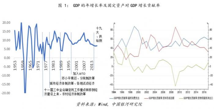 过去四十年中国创造了举世瞩目的增长奇迹,不仅GDP年均接近10%的高增速,更在经济下行周期保持了足够的韧劲和反弹的动力,这都离不开持续有力的改革开放(如图1左所示)。我国目前已从一个完全封闭的计划经济体逐步发展成了一个相对开放包容的以市场经济为主导的经济体。