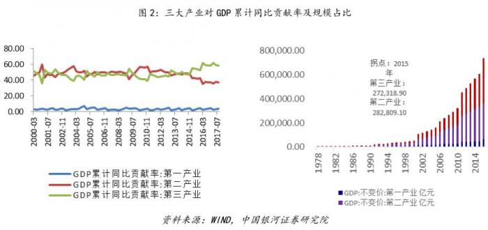 自2010年以来,第三产业已呈现出日渐强劲的发展态势。从三大产业对GDP累计同比的拉动可看出,第二产业对GDP的贡献逐渐下降,第三产业与第二产业对GDP的贡献在2015年出现拐点(如图2左所示)。2017年9月第三产业对GDP累计同比的拉动达4%,远超同期第二产业(2%)。多项数据表明,中国经济已从物质驱动型经济过渡到了服务驱动型经济。