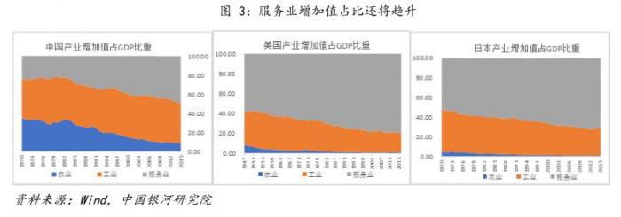 经济体走向成熟的标志是第三产业的崛起并逐渐成为经济发展主导力量。美国工业化完成后,服务业比重不断提升至目前的80%以上。日本工业化完成后,服务业占比也从1955年的42%逐步上升到目前的70%(如图3所示)。第三产业占比、城镇化率和居民收入水平上升会增加居民对服务业的需求,固定资产边际产出率将不断下降,投资带动的经济增长趋于减少,而服务和消费升级需求所带来的经济增长会不断增加。中国目前已发生经济结构的转型变化,在进入新经济时代后服务业发展还有巨大空间。