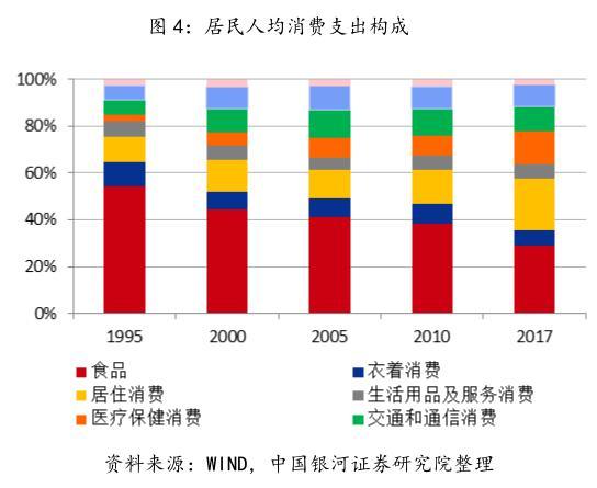 随着劳动生产率提高和收入增长,居民消费需求升级使人们对物质型商品需求的比重逐渐下降,对各类品质生活服务的需求不断增加。我国居民服务性消费支出逐年上升(如图4所示)。医疗保健消费在居民人均消费支出构成中占比由 1995年的3%上升到2017年的14%,文化娱乐同期由6%上升到9%,而食品消费则从1995年的54%下降到2017年的29%。消费领域发展趋势明显由物质消费为主转向服务消费为主,消费模式发生了结构性变化。