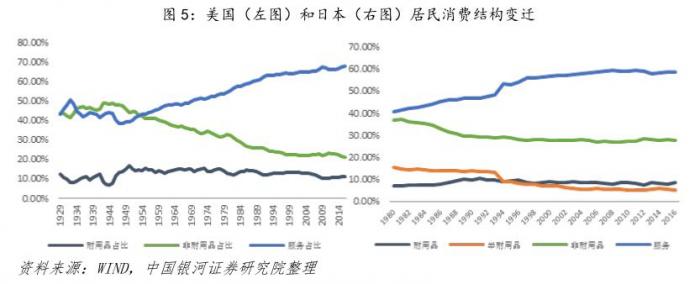 这一变化与其他发达国家发展路径高度一致。美国居民服务消费占比从上世纪五十年代的40%提升到今天的70%(如图5左所示),日本居民服务消费占比从上世纪80年代的40%提升到今天的接近60%(如图5右所示)。中国目前的服务消费支出占比大概在接近40%的水平,未来还有很大上升空间。