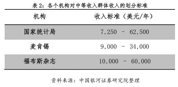 所谓中等收入群体,主要标准除收入外(如表2所示),家庭还应有一定数量储蓄和其他货币资产,人均居住面积稍高于全国平均水平,家庭恩格尔系数为30%至34%左右,家庭成员有旅游健身、观看中高档文艺演出等的愿望和经济能力,有较高技能或谋生能力及较高文化水平等。