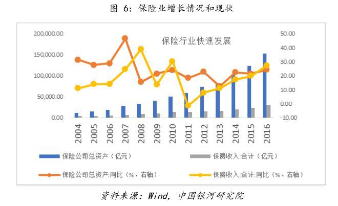 近年来,人们越来越重视长期消费,居民消费模式在逐渐由当期向跨期转变。随着居民收入不断提高,跨期消费需求超过当期消费且不断增长,特别是金融理财需求将逐渐从短期为主转向长期为主。家庭提前消费所产生的融资需求和未来预期消费所产生的投资需求,增长都非常迅速,已开始带动中国保险市场近几年迅速成长为全球第二大保险市场。自1999年到2016年,保险业总资产从2604亿元上升到15.11万亿元,年复合增长率达26.99%;保费收入规模也从1999年的1393亿元上升至2016年的3.1万亿,年复合增长率达20.01%(如图6所示)。保险深度和密度已显著提高,但离全球平均水平仍有距离。
