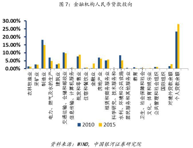 从贷款投向结构看,个人贷款规模占比近年来增长显著,制造业贷款占比出现下滑(如图7)。