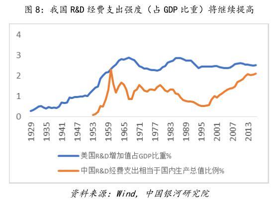 目前中国已发展起门类齐全、独立完整的工业产业体系。供给侧结构性改革已迈开产业升级步伐,2017年传统工业部门集中度明显提升、产能利用率回升、行业绩效开始普遍好转。近年中国研发经费投入强度一直呈稳定上升趋势,与发达国家差距逐年缩小,2016年达到2.1%,离《国家中长期科学和技术发展规划纲要(2006—2020年)》中设定的目标还有一段距离(如图8所示)。基础科学、技术研发持续大力投入将孕育一大批新思想、新技术帮助传统产业转型升级,中国从工业大国向工业强国转变正在进行中。特别是在信息技术尤其是互联网和人工智能等方面,中国与发达国家已经站在同一条起跑线上,甚至某些方面拥有较大优势,这一优势的发挥正在加快对要素信息化改造、加深互联网创新成果与经济社会各领域的融合,会进一步提升传统行业效率。