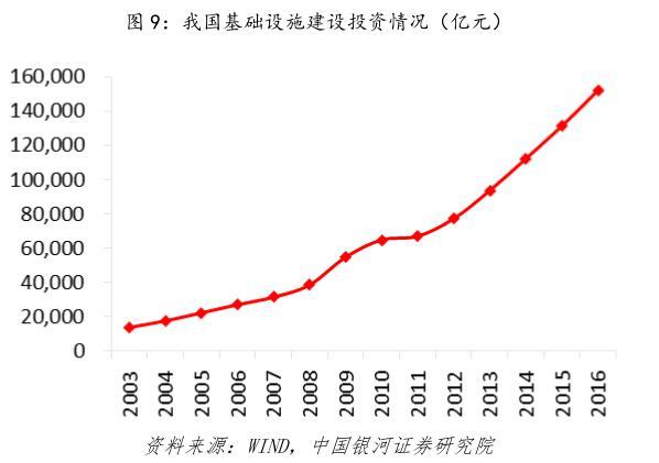 基础设施不断升级为我国经济发展奠定坚实基础。近年来,我国一直坚持把基础设施建设作为促进经济发展和提升民生服务保障能力的重要基础,全面加快基础设施建设步伐,基础设施建设投资大幅增加到了2016年的15.2万亿元,处于全球首位(如图9所示)。2016年,我国发电量6.14万亿千瓦时,新增第四代移动通信用户3.4亿、光缆线路550多万公里。截至2017年年底,全国高铁营业里程为2.5万公里,占世界高铁总量的66.3%,互联网、大数据等领域的创新成果与经济社会各领域深度融合,极大地提升了传统行业的生产效率。