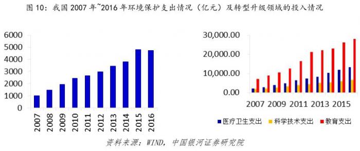 粗放型增长模式已不可持续。近年来我国已开始强调要高质量、可持续发展,加强生态文明建设,严肃问责,建设国家生态文明试验区,实现经济、社会、资源、环境保护的协调发展,实践“绿水青山就是金山银山”的新发展理念。政府已经开始逐年加大投入治理环境问题,在2015年投入到达峰值为4,803亿元,自2007年至今环保支出涨幅达375%(如图10左所示)。人力资本是规模报酬递增重要内生增长动力之一。我国近年在科教文卫等领域的投入呈现逐年上涨趋势,尤其医疗卫生支出十年规模扩张近十倍,2016年的政府投入规模达1.3万亿元(如图10右所示)。教育支出和科学技术支出增长十分明显,2007年-2016年涨幅达400%,表明国家对人才和技术发展的高度重视,二者将为我国未来经济的高质量发展奠定坚实基础。
