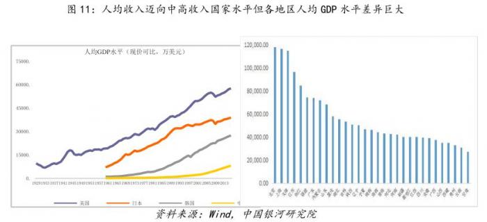 我国地域广阔,人口众多,各地区经济发展水平存在很大差异。从人均GDP指标来看,2016年北京、上海、天津三个直辖市人均GDP都超过11万元人民币、已达到发达国家水平,但与世界一流发达国家相比也还存在差距(如图11左所示);排名末位的甘肃人均GDP仅有2.7万元,处于欠发达国家人均收入水平(如图11右所示)。从各地区对全国经济总量贡献看,2016年发达地区与中部地区对于GDP贡献率达71.85%,成为拉动经济增长主要动力。